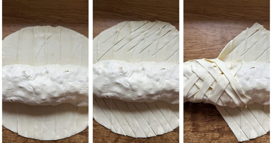 place the cylinder on the round puff pastry disk, cut the sides into a fishbone pattern and cross them over the roll, forming a braid.