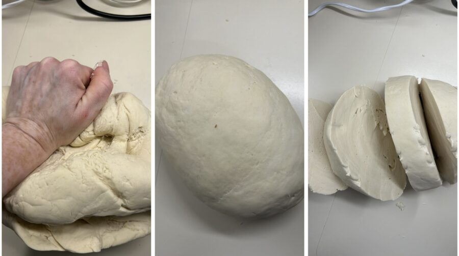Work it by hand a little more until you obtain a single mass as smooth as possible. If you can’t, let it rest for another 10 minutes covered with a cloth and resume kneading. Then shape into a ball and divide into 4 equal pieces.