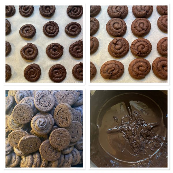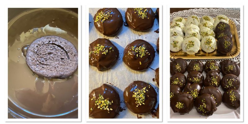 With a spatula, spread the chocolate over the rame, or dip them by the rounded side into the chocolate, then place them on parchment paper and sprinkle with a pinch of chopped pistachios or almonds.