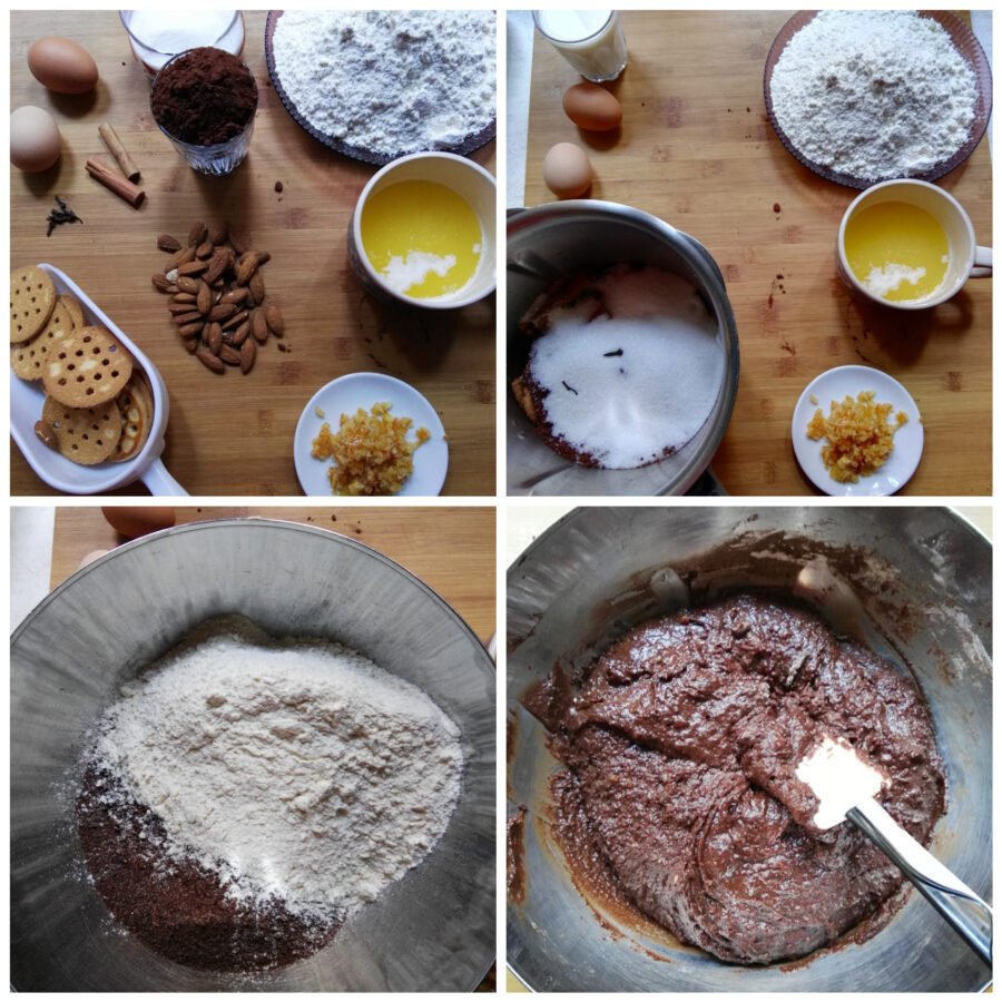 To make rame di Napoli, start by chopping and mixing together all the dry ingredients: cocoa, vanillin, sugar, crushed cookies, cinnamon, cloves and almonds briefly toasted in a pan. Pour everything into a large bowl and add the flour.