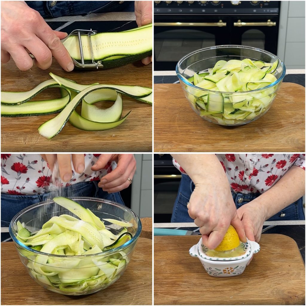 Wash the zucchinis and slice them into very thin strips using a peeler or a mandoline, obtaining long, delicate ribbons. Collect them in a bowl, lightly salt them and let them rest for a few minutes.
