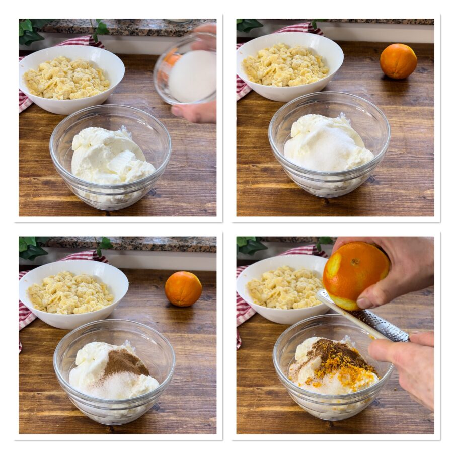 Take the ricotta — it must be well drained and preferably from the day before — put it in a bowl together with the sugar, the cinnamon, the orange zest and the vanilla extract, mix and