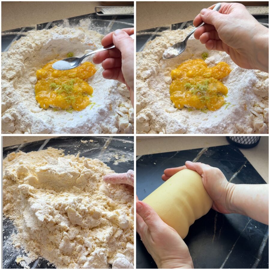 Pour the yolk into the center, then begin to mix with a fork, gradually incorporating the sugar and the flour.