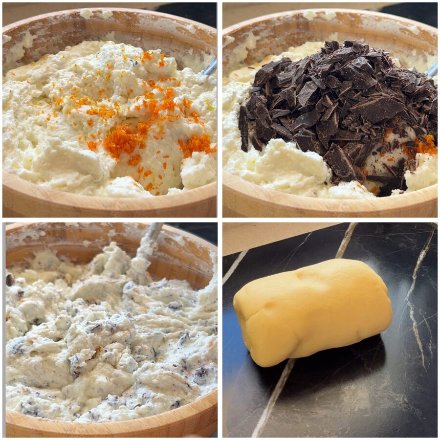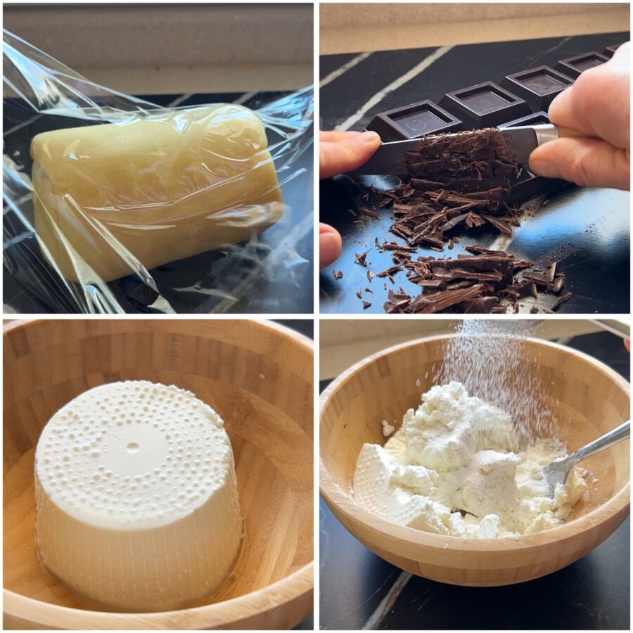 Chop the dark chocolate into flakes and gently fold it into the ricotta cream, stirring calmly. If you like, add a pinch of cinnamon.