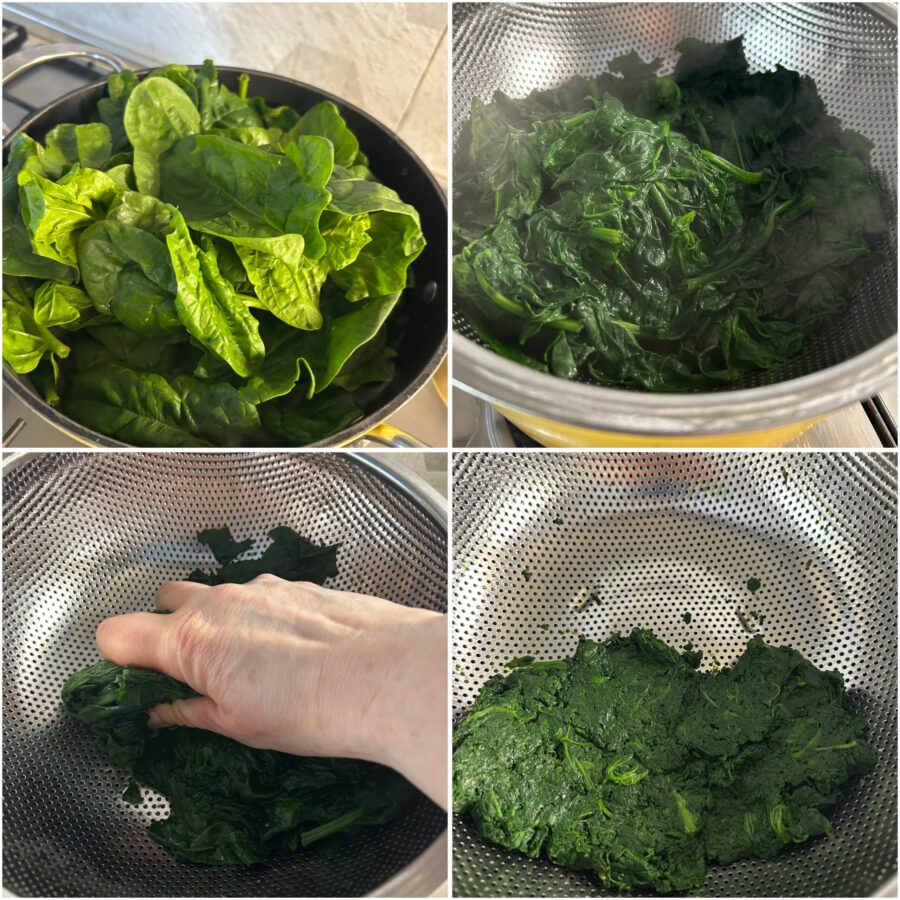 Transfer the spinach to a colander and let it cool slightly. Then squeeze it very well with your hands to remove all excess water: this is a crucial step to obtain compact, firm gnudi. Once properly squeezed, the spinach will shrink considerably, losing around half of its initial weight.