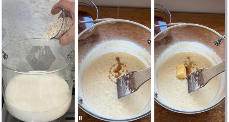 To make the risolatte, bring the milk with the sugar and a pinch of salt to just below boiling and add the rice.