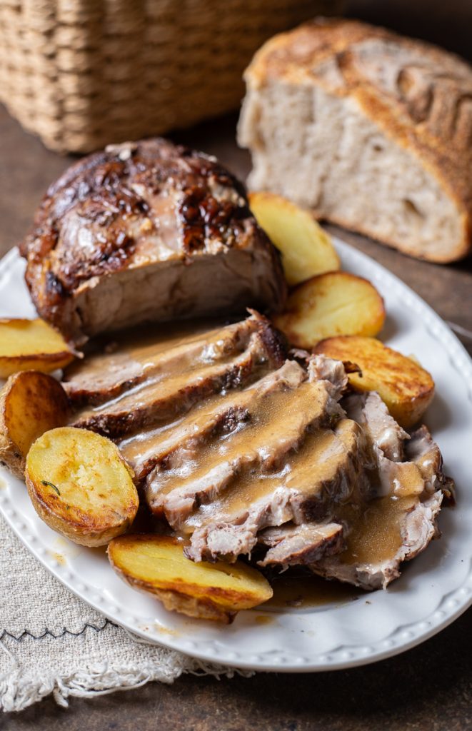 Oven-roasted pork capocollo with buttery potatoes or extra-tender capocollo roast, the recipe for an economical and tasty roast that always remains very tender and succulent. The oven-roasted pork capocollo is a traditional Italian roast, a main course from the poor peasant tradition, made from the rear part of the pig’s neck — a fatty cut usually used for charcuterie. The capocollo’s long cooking time allows the fat to melt and the connective tissue to turn into a tasty gelatin, which softens the meat, making it particularly tender and succulent without the need to measure the internal temperature with a thermometer. Despite being an economical dish, capocollo roast can also be a rich and flavorful meat main course to serve at Christmas, New Year’s or Easter, just like the Orange Pork Tenderloin. Let’s head to the kitchen: I’ll explain how to prepare a delicious roast on a budget and how to accompany it with a side of golden, fragrant potatoes. Remember that if you want to stay updated on new recipes you can follow my Facebook page and my Instagram profile.