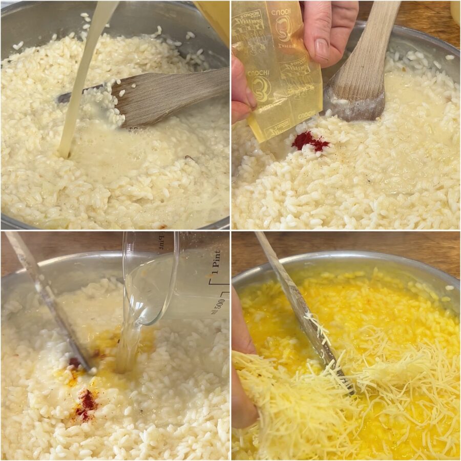 When the rice is still very al dente, off the heat dilute with more broth or water to avoid it being too dense and add the saffron. Stir and season with almost all the grated cheese.