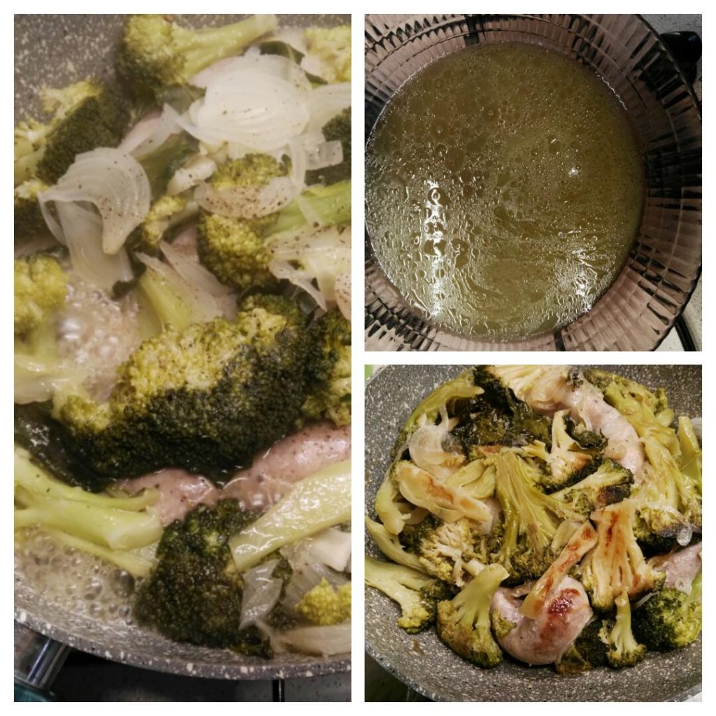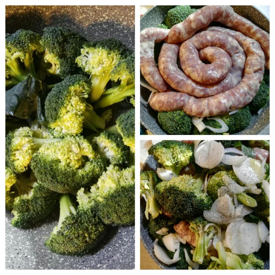 Arrange a layer of broccoli in a frying pan or a low wide pot and add half of the sliced onion, then place the sausage on top and continue with onion and broccoli. Add a bit of black pepper and a drizzle of olive oil. Add salt only if needed, as the sausage is already quite salty and you may overdo it. Cover the pan with its lid, turn on the heat and cook for 45 minutes over very low heat without touching anything.