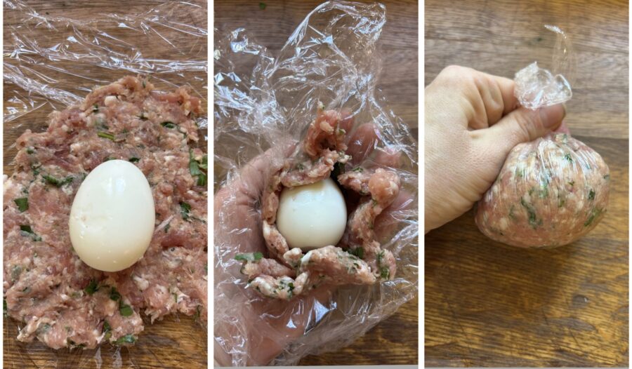 With the help of the plastic wrap, make sure the meat covers the entire egg evenly, remove any excess, and once you have formed a meat coating around the egg about 3/16″ thick (about 0.2 in), wrap tightly in the plastic wrap and set aside.