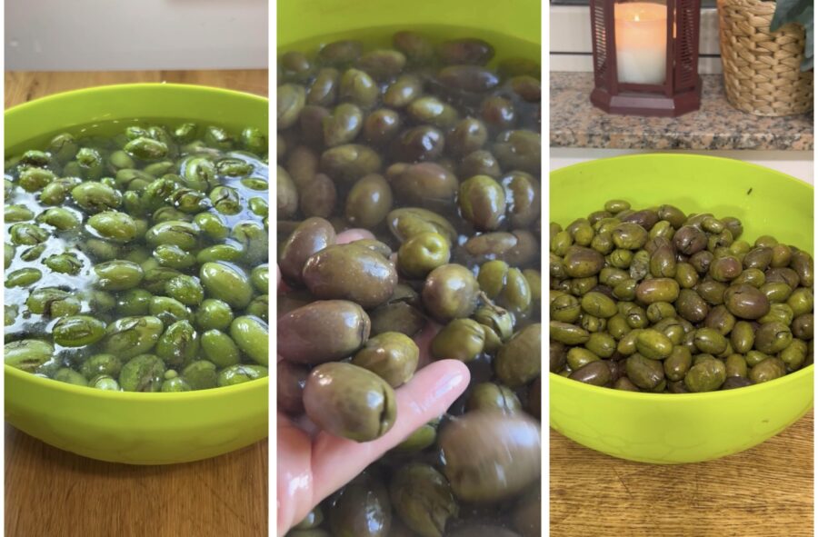 Proceed by doing a complete change of water and salt every 24 hours for about 10–12 days, keeping the amount of 100 g of salt per liter constant. As the days go by and the brine is changed, their color will darken because the water penetrating them removes bitterness but also causes some oxidation.