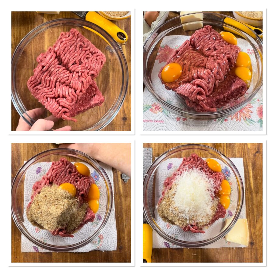 Choose ground veal that is not too lean, gather it in a bowl and add the eggs — I know they seem like many, but my mother-in-law sometimes uses even more :- ) — the breadcrumbs and the grated cheese. If you like, you can replace part of the cheese with aged pecorino. Mix to obtain a homogeneous mixture and let it rest for 10 minutes so the breadcrumbs absorb excess moisture and the mixture becomes firmer.