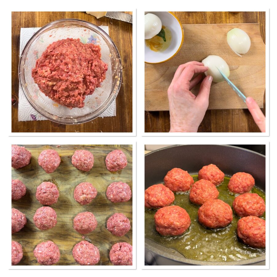 While the meat rests, peel, rinse and chop the onions, then form the meatballs which should be slightly larger than a walnut.