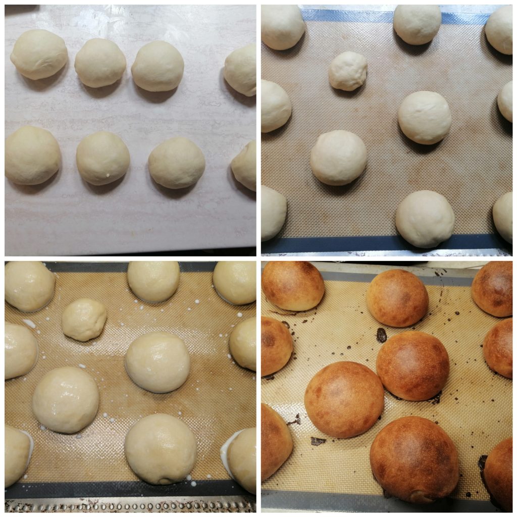 With the help of a bench scraper shape many small dough balls and set them to rise until doubled; this will take about 40 minutes. After that time, preheat the oven to 356°F (static mode), brush the buns with milk and bake.