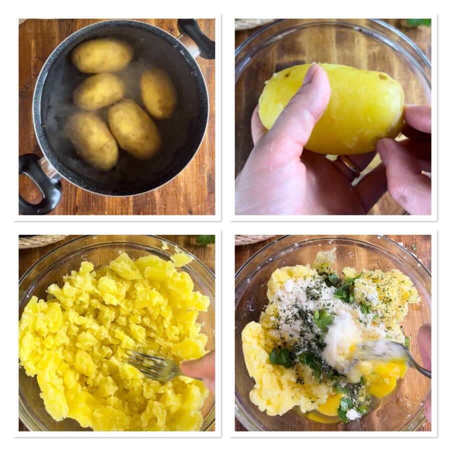To prepare the croquettes according to tradition you need to boil the potatoes. Simply immerse them in a pot full of water, add salt and set over heat. Cook for about 35–40 minutes, or until a skewer inserted in them comes out soft. Avoid overcooking them so they don’t absorb too much water; turn off the heat, let them cool slightly and peel them. Roughly chop the cooked potatoes and mash them with a fork; you should obtain a homogeneous mixture but with some slightly larger bits of potato. Add the cheese, eggs, salt, parsley and mix together.