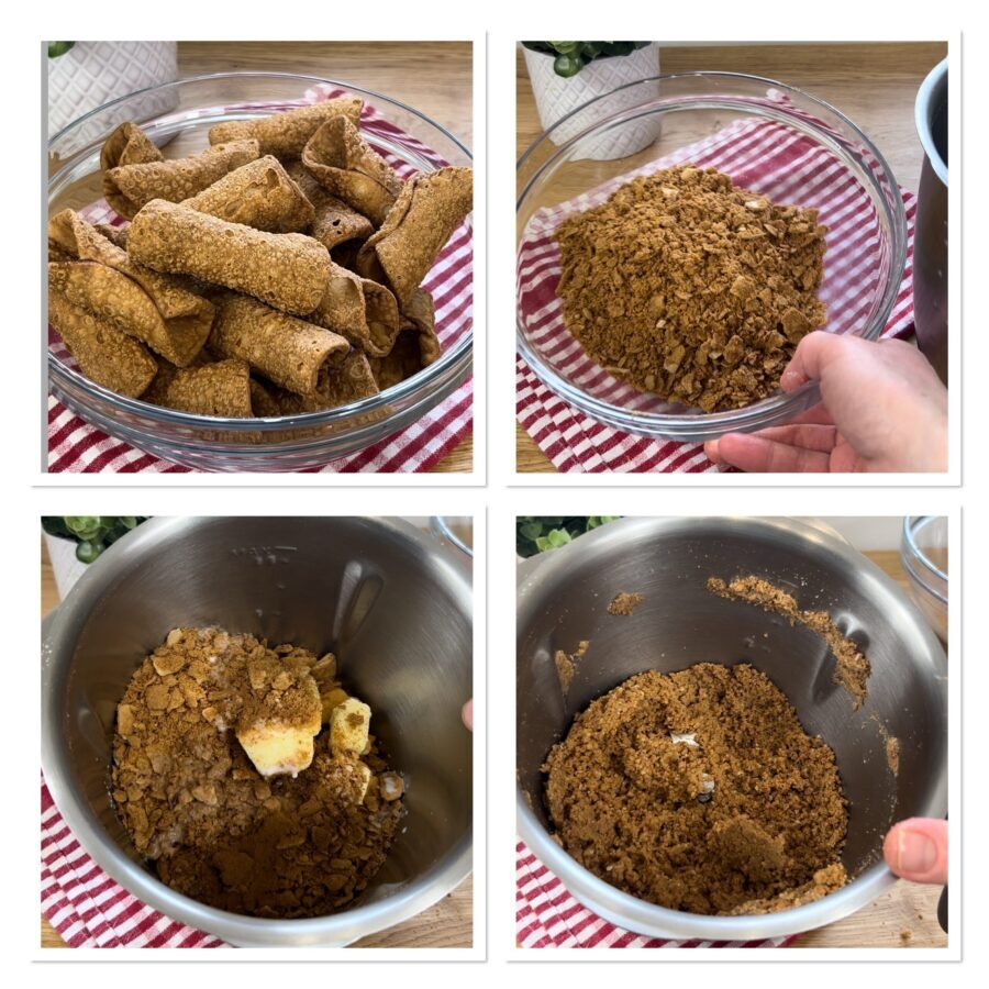 After preparing all the ingredients, crumble the cannolo shells with your hands to obtain coarse crumbs of various sizes. Put half of them into the blender bowl together with the cookies, milk, butter and cinnamon; blend until you obtain a mixture similar to wet sand.
