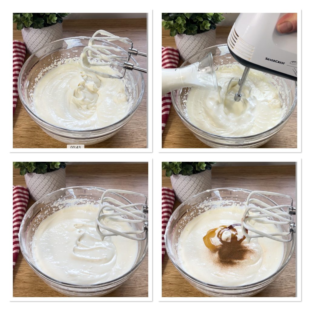 Pour the cream in a thin stream while continuing to whip, add the cinnamon, fresh orange zest, vanilla extract and mix.