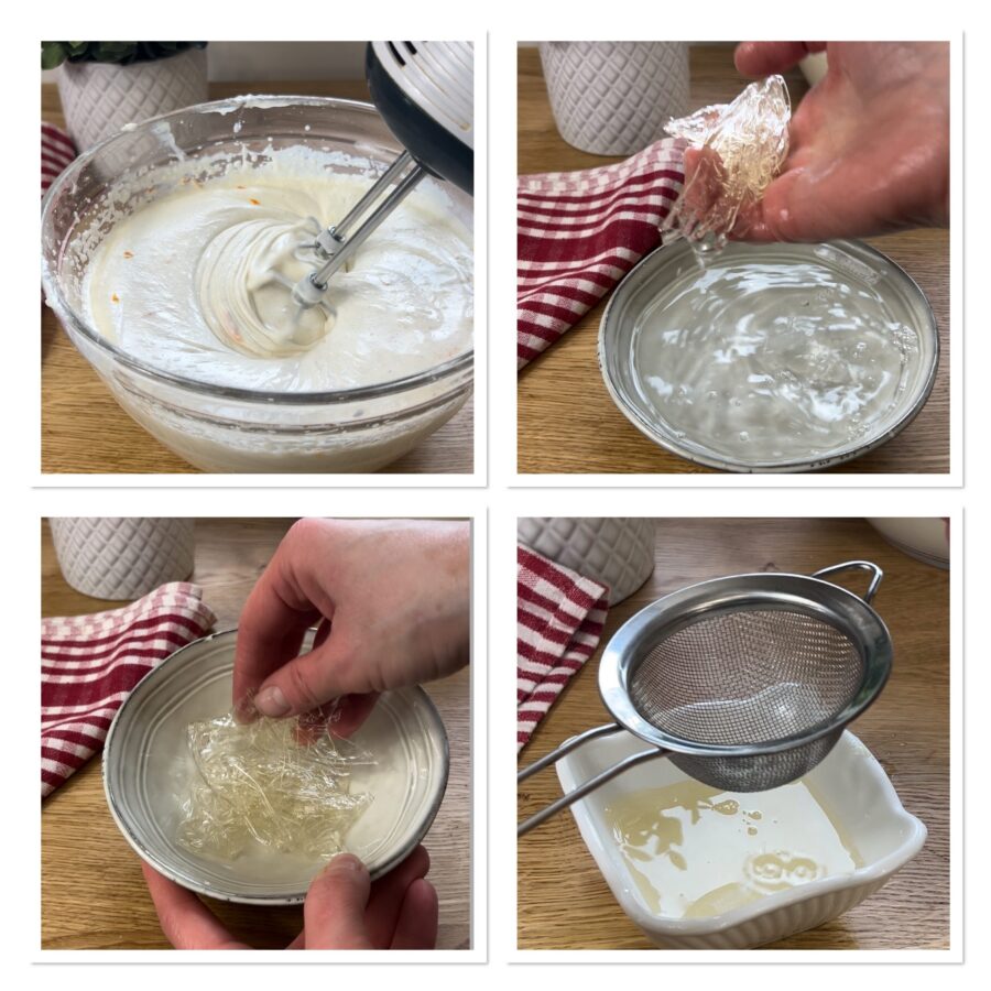 Soak the gelatin in very cold water for about ten minutes, squeeze it lightly and put it in a small container, add two or three tablespoons of water and dissolve it in a bain-marie or in the microwave for just a few seconds (about 3–4).