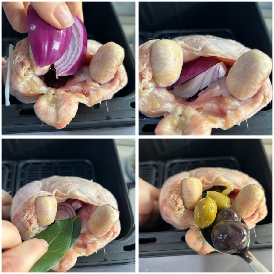 • Stuff the inside of the chicken with some of the prepared seasoning, sliced onion, olives, a bay leaf and a sprig of rosemary, so the meat is well flavored during cooking.
