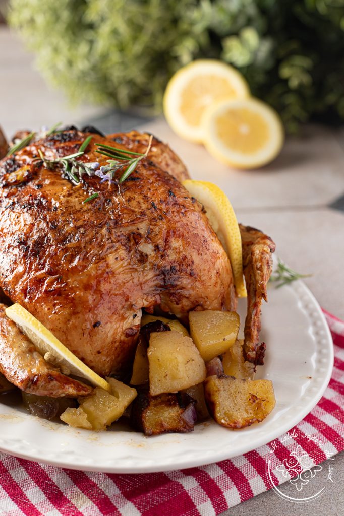 This version of roast chicken is one of those dishes I often make when I need something easy but that everyone likes, especially my children. It’s an uncomplicated recipe that smells of simplicity and tradition and brings back those family lunches remembered fondly. In my recipe, handed down from my grandmother, the chicken is flavored with extra virgin olive oil, lemon, onion, olives and aromatic herbs, then slow-roasted in the oven until tender and juicy. The potatoes, added halfway through cooking, soak up all the pan juices and become golden and flavorful, just the way we like them.