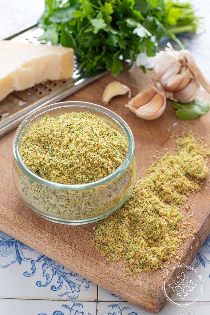 Seasoned breadcrumbs for perfect coatings and gratins. For many this is the Sicilian-seasoned breadcrumbs for cutlets, fish and vegetables, but for us this is simply the traditional recipe that accompanies all the tastiest breadings and is fully part of the Sicilian cuisine recipes. The ingredients are few: breadcrumbs preferably homemade and made from semolina bread, grated cheese such as Pecorino or caciocavallo, garlic and parsley, but the result is a tasty seasoning to use in a thousand recipes and even in the mixture for grandma’s meatballs. Useful like Panko but much more versatile. Whether it’s cutlets, meatballs or gratinated vegetables, the seasoned breadcrumbs give every dish a simple but unique flavor, letting us bring lots of taste to the table without spending much. These seasoned breadcrumbs on fish are perfect, but they are just as good on meat and all vegetables; they are prepared in a moment and are truly special. Ready to discover how to make them? Let’s go to the kitchen. Also, remember that if you want to stay updated on new recipes you can follow my page Facebook and my profile Instagram.