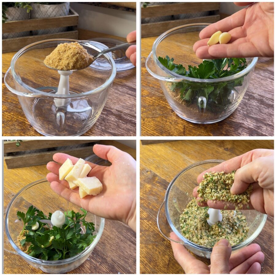 • To make the seasoned breadcrumbs I suggest using rustic breadcrumbs; you can make them at home starting from stale bread or buy them at the bakery — that’s how we do it. Gather them in the blender jar together with the rest of the ingredients and a pinch of salt if the bread lacks salt, and blend until you obtain a homogeneous mixture. Our seasoned breadcrumbs are ready to be used in all the preparations you desire.