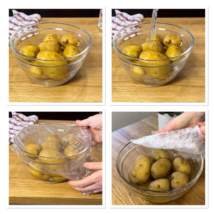 • Put the potatoes in a pot, cover with water, add salt and cook for 35-40 minutes from the boil or until a skewer goes through them easily. Drain them and let them cool gently at room temperature. Or do as I do: place them in a bowl after washing, pour in half a glass of water and cover tightly with plastic wrap. Cook in the microwave at 750W for 20 minutes, then remove and let them cool a few minutes before mashing with a potato ricer (no need to peel them — the skins will stay in the ricer).