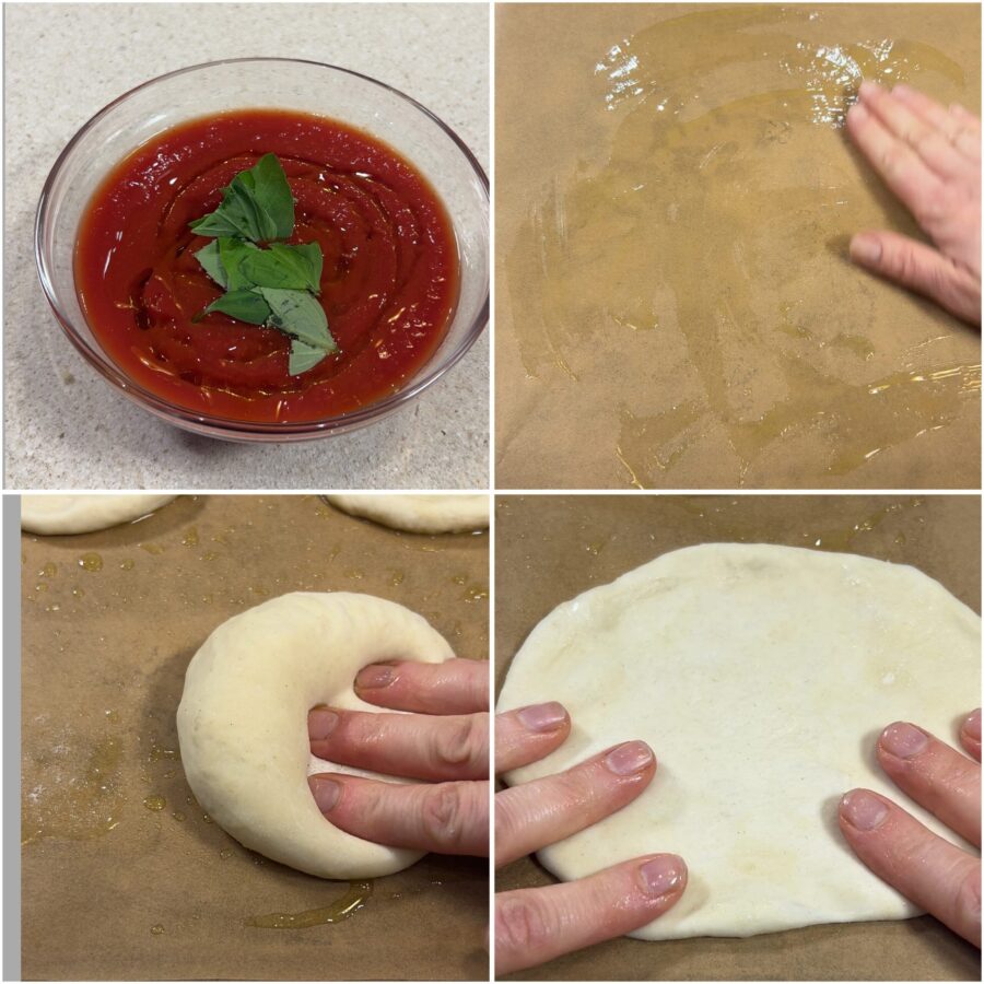 Place them on a baking tray lined with parchment paper and lightly oiled, and gently press them with your fingers to form discs. Let them rest for a few more minutes. Season the tomato purée with salt, oil and basil and spread it evenly over the pizzettes.
