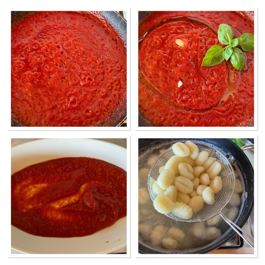Salt the water and as soon as it reaches a full boil, drop in the gnocchi — you will see them immediately rise to the surface. Scoop up about half with a slotted spoon and distribute them over the baking dish.