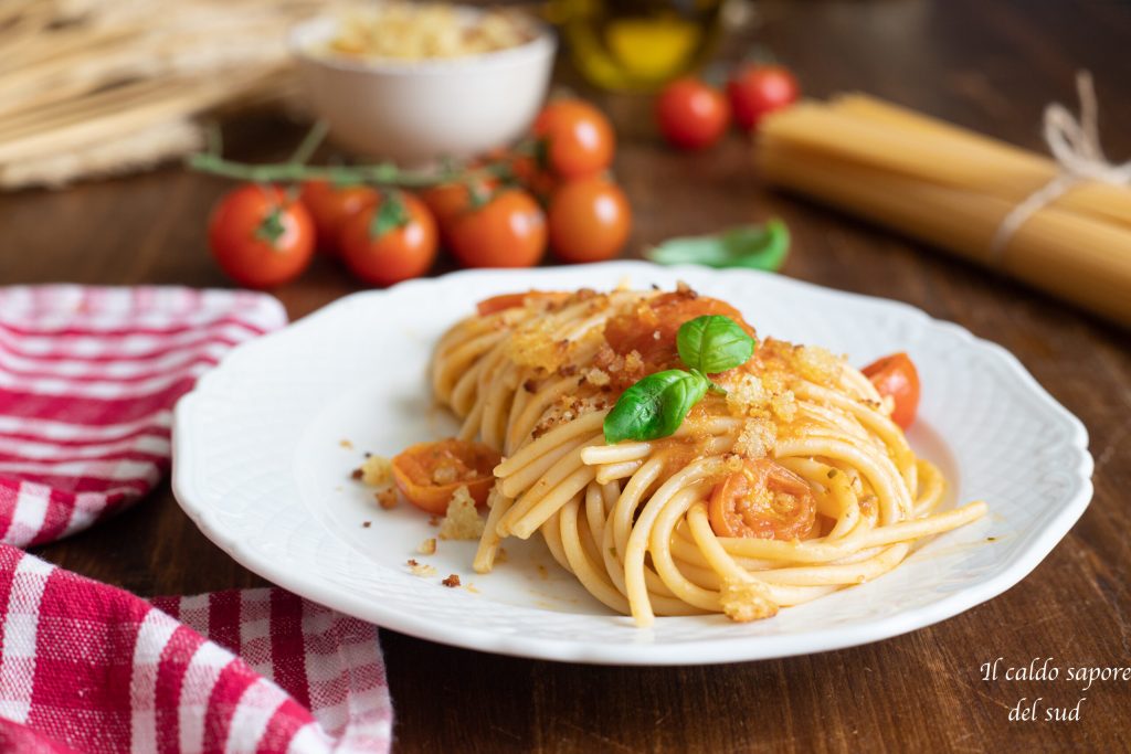 When the pasta is cooked, drain it al dente, add it to the cherry tomatoes together with a little cooking water, toss to combine and when a lovely creamy sauce forms on the bottom of the pan, plate and sprinkle with the toasted bread crumbs.