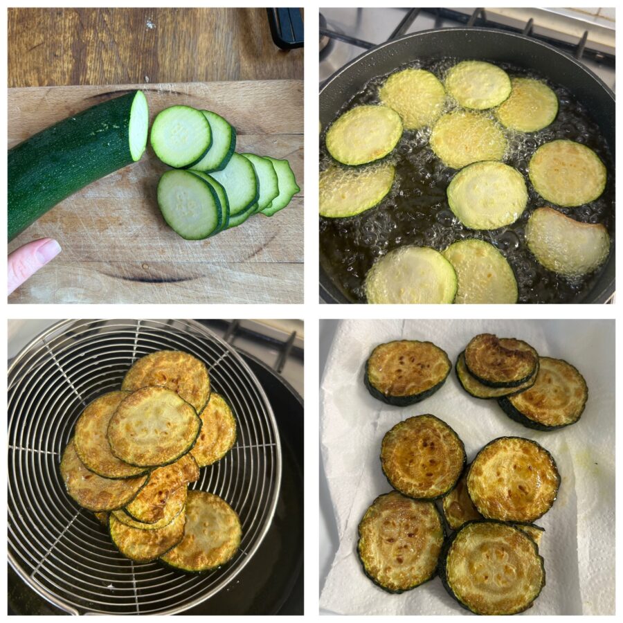 To make spaghetti alla Nerano, put the water on to boil for the pasta and start preparing the zucchini: wash them, trim the ends, slice them into thin rounds about 3–4 millimeters thick (about 1/8–5/32 inch) and heat the olive oil in a large skillet. Fry the zucchini slices a few at a time in the hot oil and cook them for about 5–6 minutes, just until golden. Remove them with a slotted spoon and place them on a tray lined with paper towels so the paper absorbs the excess oil.