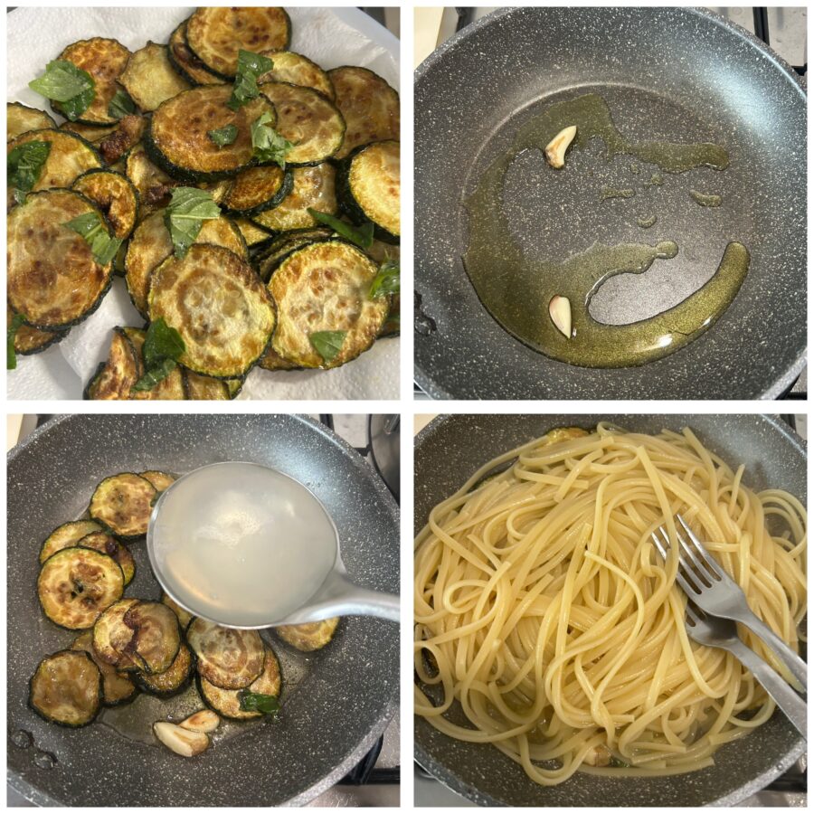 As you cook the zucchini, season them with salt and torn fresh basil. Put the pasta into the boiling lightly salted water, warm a little oil with a garlic clove and add the zucchini, pouring in a little cooking water to soften them. After about 6 minutes of cooking the spaghetti (I actually used linguine), drain them and transfer them to the pan with the zucchini, being careful to reserve some cooking water.