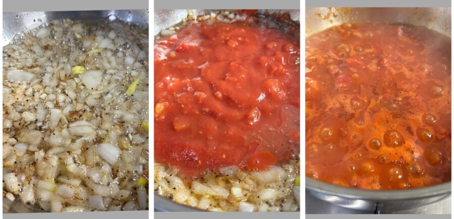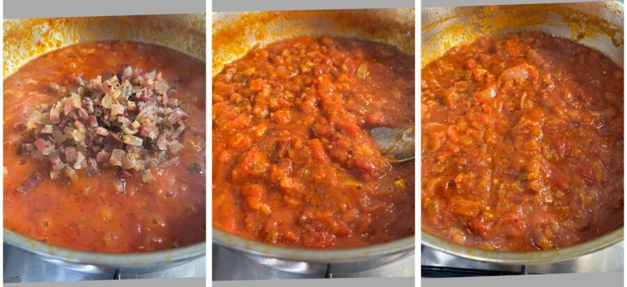 In the same pan with the cooking fat from the guanciale, add the whole chili pepper (seeds removed) and let the chopped onion wilt. Once golden, add the peeled tomatoes and crush them with a fork. Cook over moderate heat for about 15 minutes and adjust the salt if necessary.