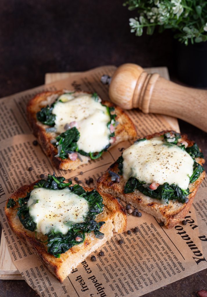 Serve spinach bruschetta immediately and prepare only the number of bruschetta you plan to consume. It is not recommended to assemble them in advance; however, the spinach and the bread can be prepared a few hours ahead of time.