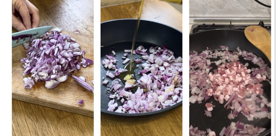 Peel and finely chop the onion, then sauté it in olive oil until golden. Add the pancetta, cook for about a minute and add the cleaned, rinsed and drained spinach (I use the pre-washed bags of spinach ready for cooking).