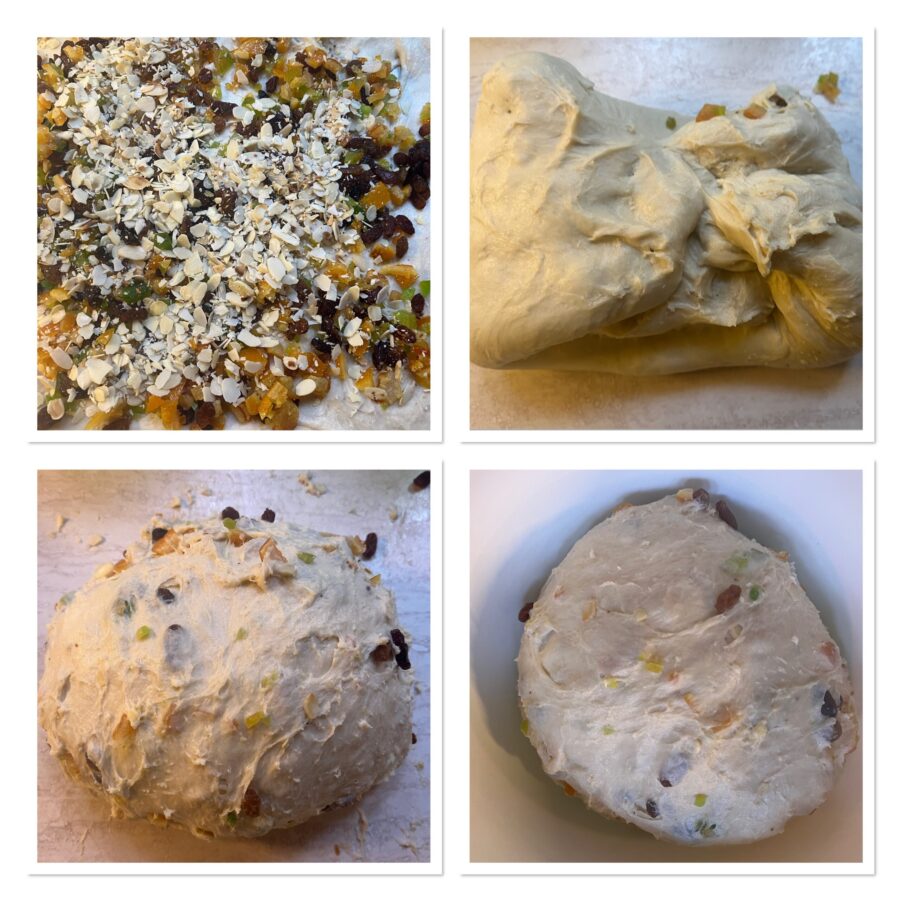After the resting time, roll the dough out on the work surface and spread it out. Distribute the candied fruit cut into very small pieces, the raisins, the sliced almonds (previously toasted in a pan or in the oven), the orange and lemon zest and the spices (I use cinnamon and nutmeg; I don’t like cardamom). Fold the dough over, make a few turns to distribute the additions evenly, form a ball and return it to a warm place to rise again, this time until it doubles.