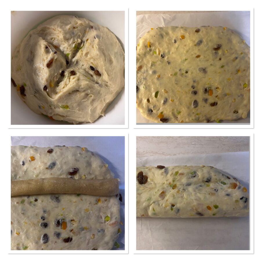 When the dough has risen (3–4 hours later), divide it into two portions of about 2.2 lb each and proceed to shape the stollen one at a time.