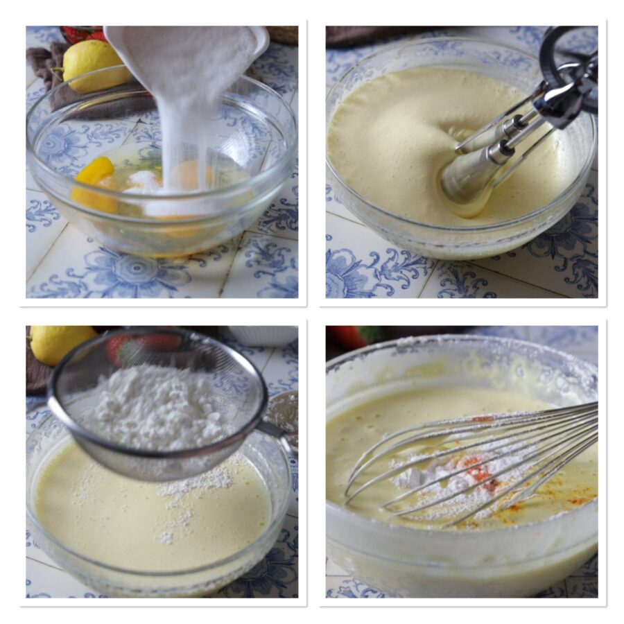 Prepare the sponge cake (pan di Spagna). Beat the eggs with the sugar until you obtain a fluffy, foamy mixture. Add the sifted cornstarch and then the sifted flour. Add the baking powder, vanilla extract and coloring, then mix gently.