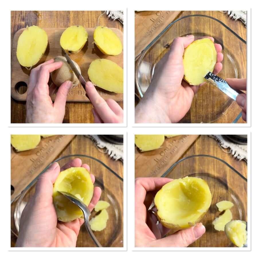 • Place the potatoes in a pot, cover with water, add salt and cook for 35-40 minutes from boiling or until a skewer goes through them easily. Do not overcook them; it’s better to leave them slightly undercooked as they will continue to cook by residual heat. Drain them and let them cool gently at room temperature. Do not run them under cold water because they would break. Once they are almost at room temperature or just a little warm, cut them in half lengthwise, but do not remove the skins. Score the sides with a knife and scoop out the flesh gently with a spoon; if you prefer, you can remove the skins at this point.
