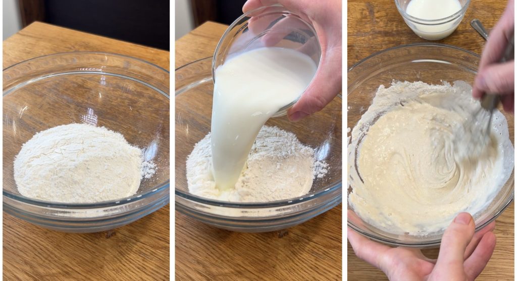 Put the flour in a bowl, pour in part of the milk and loosen it to form a smooth mixture,