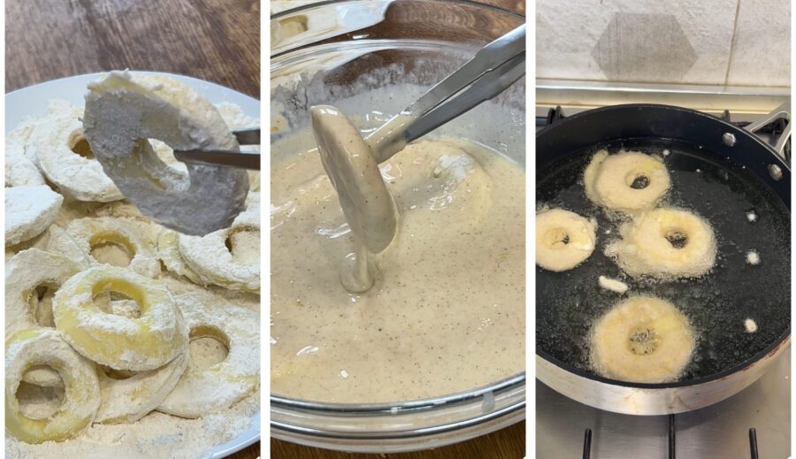 finish with a teaspoon of cinnamon and the lemon zest. Add the remaining milk, mix and let the batter rest a few minutes before continuing. Start heating the oil, dust the apple slices with flour
