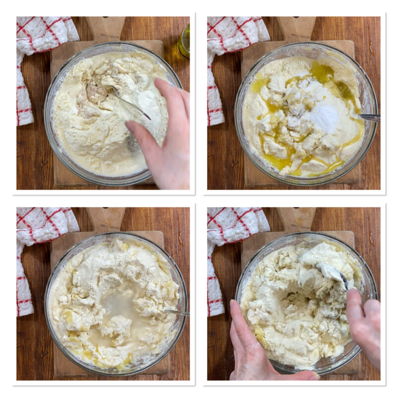 Add the sugar, the oil, and a little more water, mix, then finish with the salt and the remaining water.