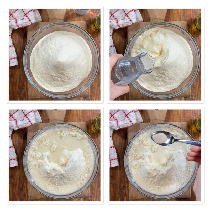 Gather the flour in a bowl, add a little warm water and the yeast, and stir to dissolve it.