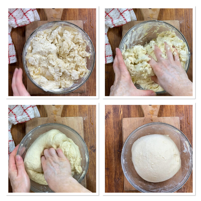 Work the dough in the bowl until you obtain an elastic, uniform mixture. Bring the edges toward the center; this will take about 7–10 minutes (you can also use a stand mixer, but avoid blade-style robots like the Bimby: the dough may have difficulty developing gluten).
