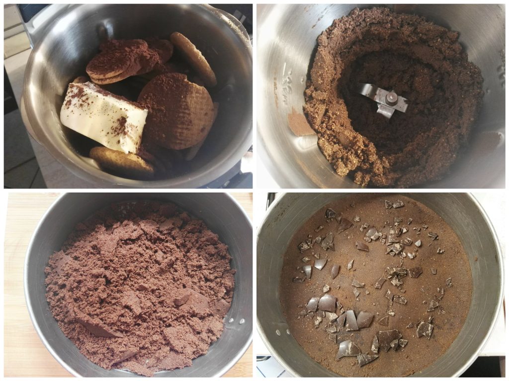place the biscuits, softened butter, cocoa and instant coffee in the bowl of a food processor and blend until you obtain a very fine, sandy mixture — but don’t heat it up too much.