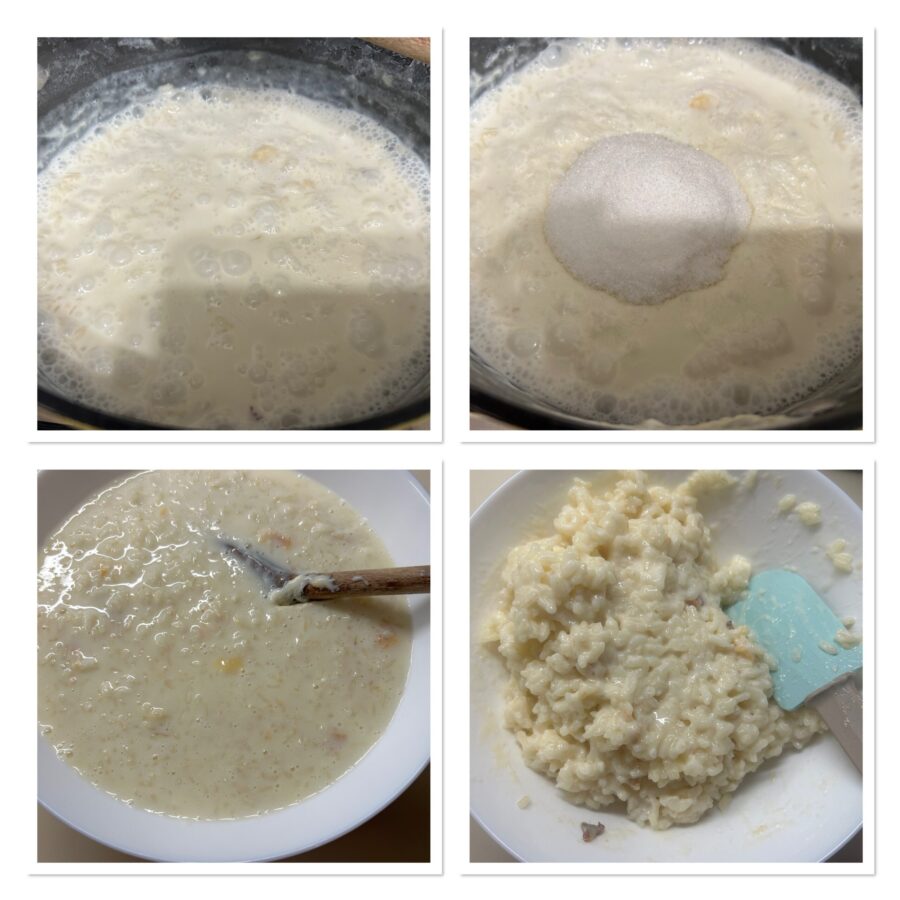 Bring the milk almost to a boil, add large pieces of lemon zest and the vanilla extract, then add the rice. Cook over very low heat until almost all the liquid has been absorbed by the rice. This should take about 30 minutes; stir frequently and add the sugar a little before turning off the heat, then cook for a couple more minutes. Transfer the rice to a bowl, let it cool, then place it in the refrigerator for 8–12 hours (the rice will thicken as it rests).