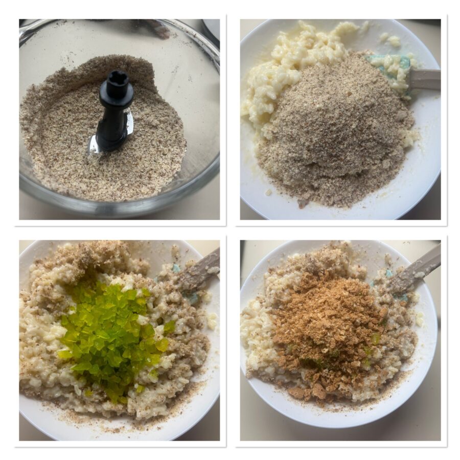 Blend the almonds to a flour; for best results, I recommend freezing them for 20 minutes and then blitzing them while cold. Add the almond flour to the rice, then mix in the chopped candied fruit and the finely crumbled amaretti, combining everything well.