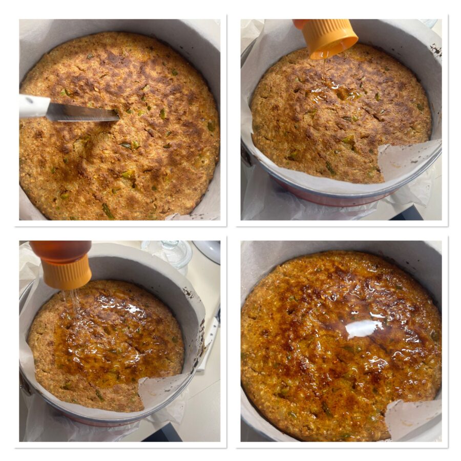 Remove from the oven and, while still hot, poke holes all over the cake with a knife and generously drizzle amaretto liqueur so the cake soaks it up thoroughly.