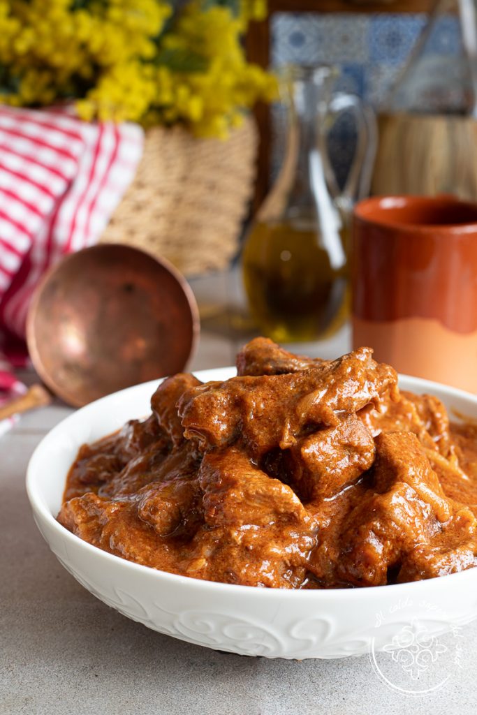 Trentino goulash or Italian-style goulash, my grandmother Fernanda’s recipe. Goulash, also called Goulash or Gulasch, is a meat stew typical of Hungarian cuisine: a spicy and flavorful dish based on beef, onions, paprika and cumin. In its original version, the Hungarian Goulash (Gulyás-leves) was a poor dish: a meat soup with potatoes, lard and sometimes peppers, also called the “shepherd’s soup”. It was a hearty and energy-rich meal, cooked over wood fires in large cauldrons to sustain the body during long, cold transhumances. Over time, the Hungarian goulash recipe spread across Europe, particularly to Germany, Austria and Trentino, changing a little. Here we are: my grandmother Fernanda was from Trentino and her Goulash was one of the Sunday main dishes, to be served with mashed potatoes or polenta, just like roast pork shank, or my beloved speck dumplings. Creamy and enveloping, the Italian-style Goulash recipe is quite simple: just follow the steps and measure paprika and cumin well to get a perfect Goulash! The most famous is the beef goulash, tender and succulent, but you could also make it with deer, veal or roe deer and even fish. Grandma, however, made it only with beef and coated the meat in flour to obtain a dish with a rich, tasty sauce, perfect for dipping homemade bread. Let’s go to the kitchen — I’m sure this dish I adore, which reminds me so much of my father and grandmother, will win you over at the first bite. Before we start cooking, remember that if you want to stay updated on new recipes you can follow my Facebook page and my Instagram profile.