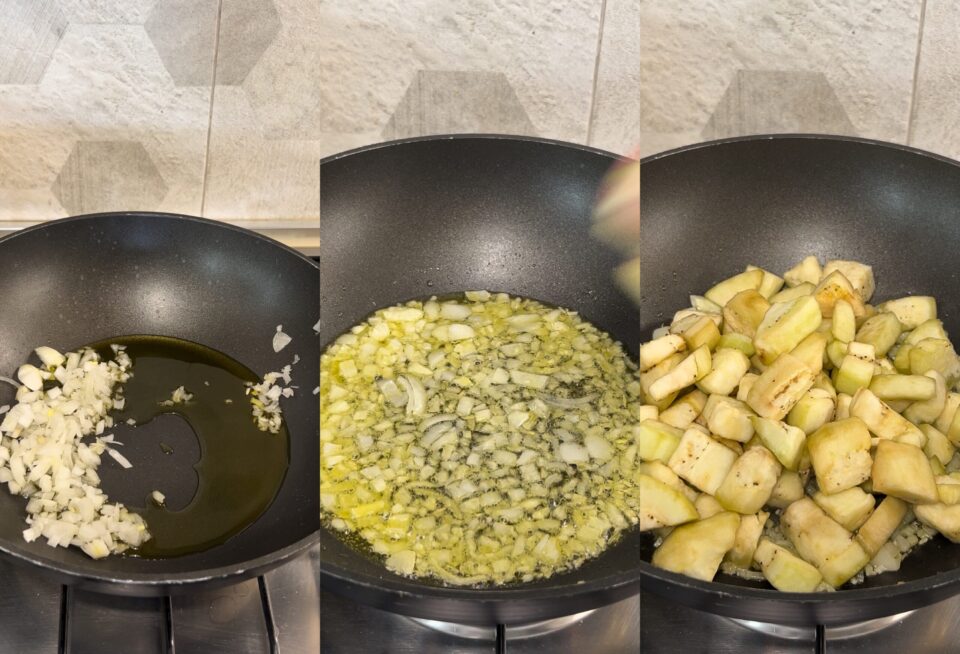 • Peel, rinse and coarsely chop the onion, put it in a pan and let it soften over low heat. Add the eggplant cubes to the onions, and cook over medium heat stirring often, until the eggplants are tender and golden brown.